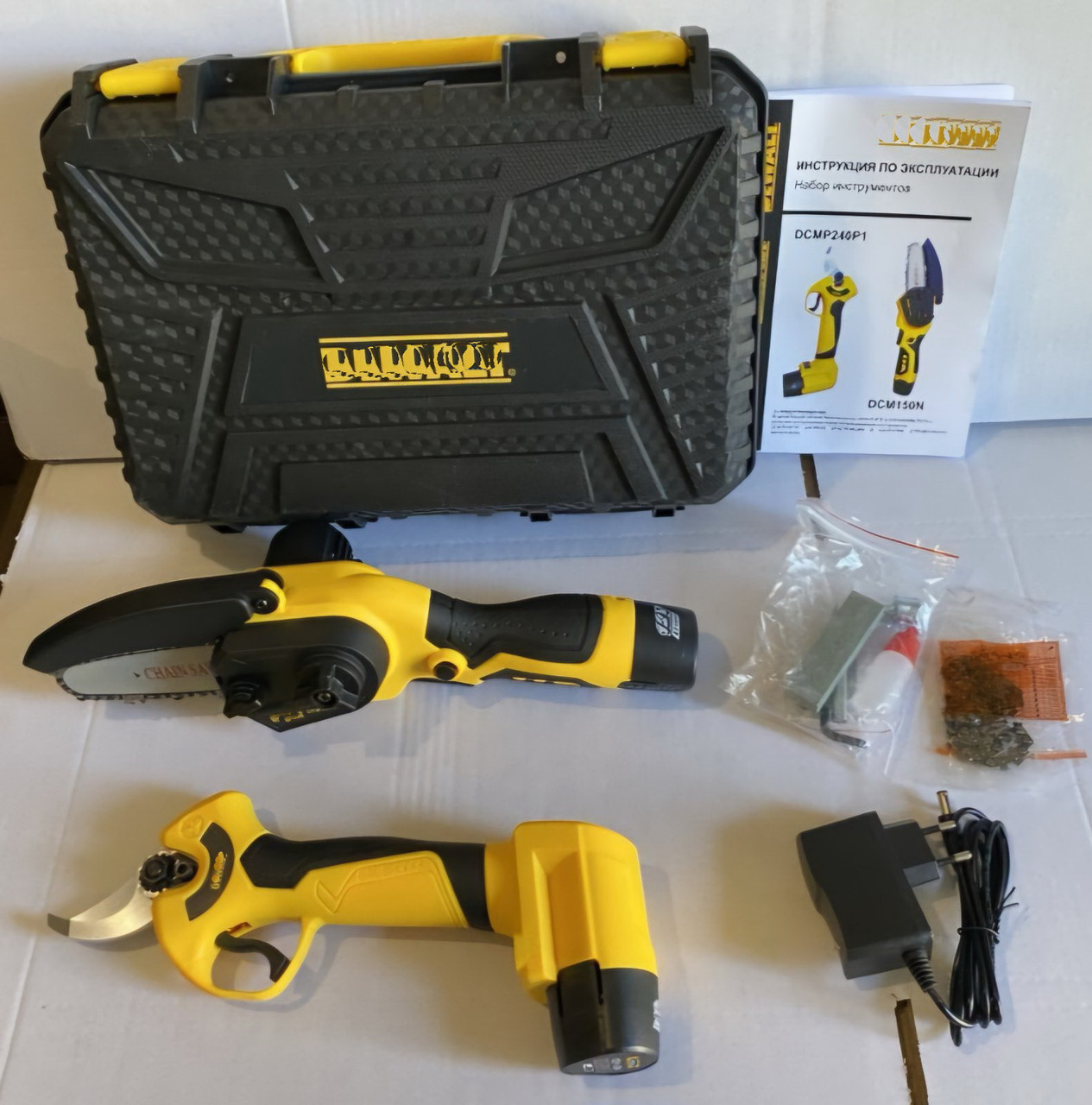 Акумуляторний набір 2в1 Деволт 12 V (Секатор DCMP240P1 + пила DCM150N). З 2 шинами (10 і 15 см) і з 2 ланцюгами. (10 і 15 см). Безключове натягування ланцюга. Суперякість.